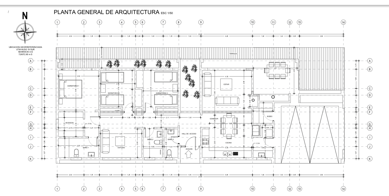 La casa cuenta con una planta. Hall de acceso y distribución que divide y separa la casa entre espacio común y zona dormitorios, con acceso a baño de visitas.