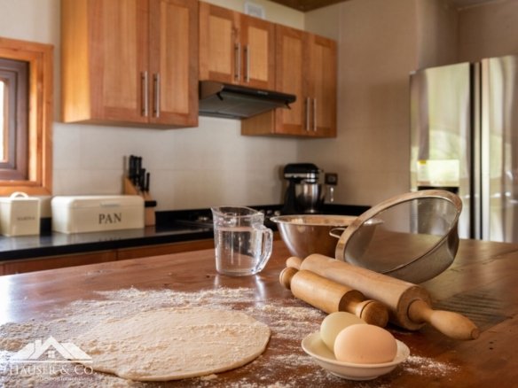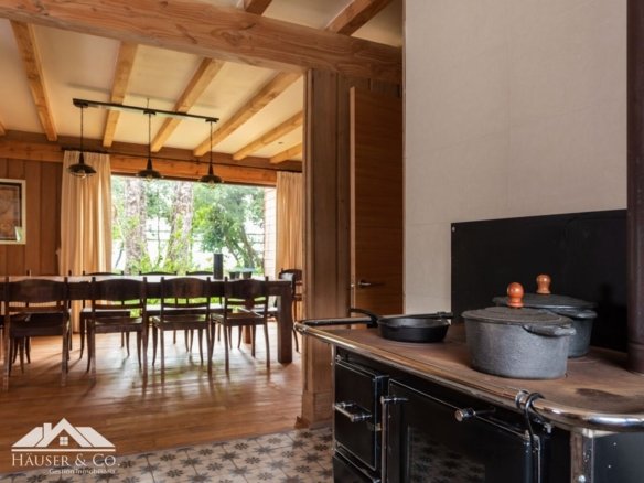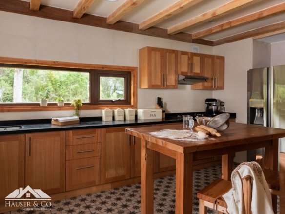 La cocina es muy cómoda, está amoblada y equipada con cocina a leña, horno empotrado, encimera a gas y campana. Despensa y lavandería interior con salida al estacionamiento.