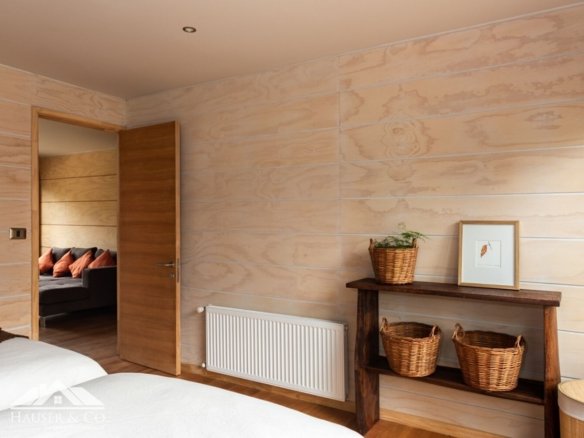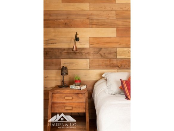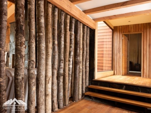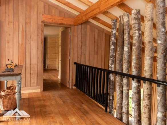 Hermosa decoración de rollizos naturales a la vista que separan la distribución hacia los dormitorios.