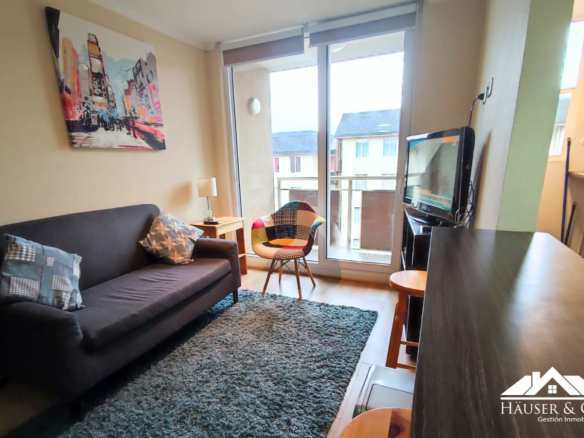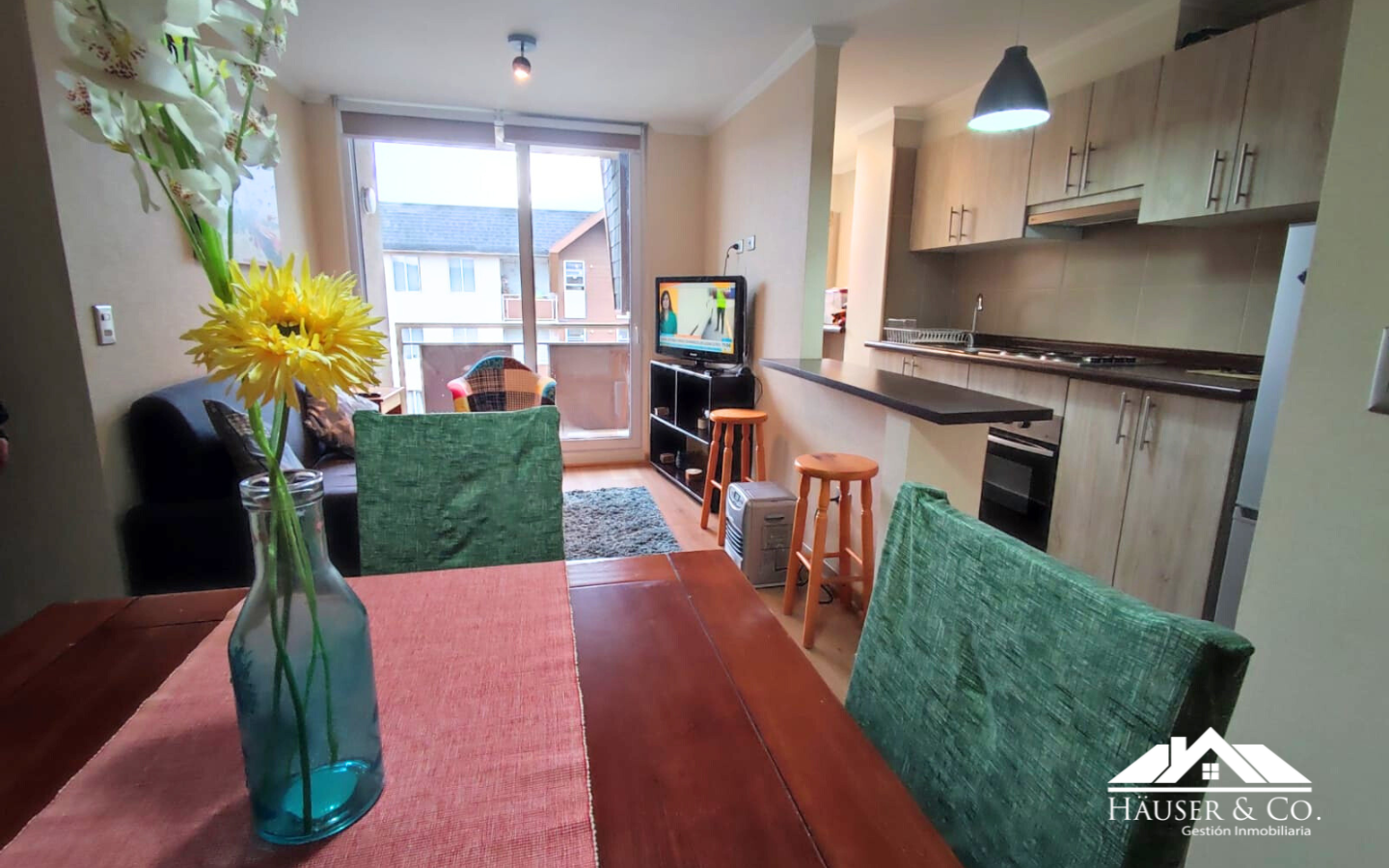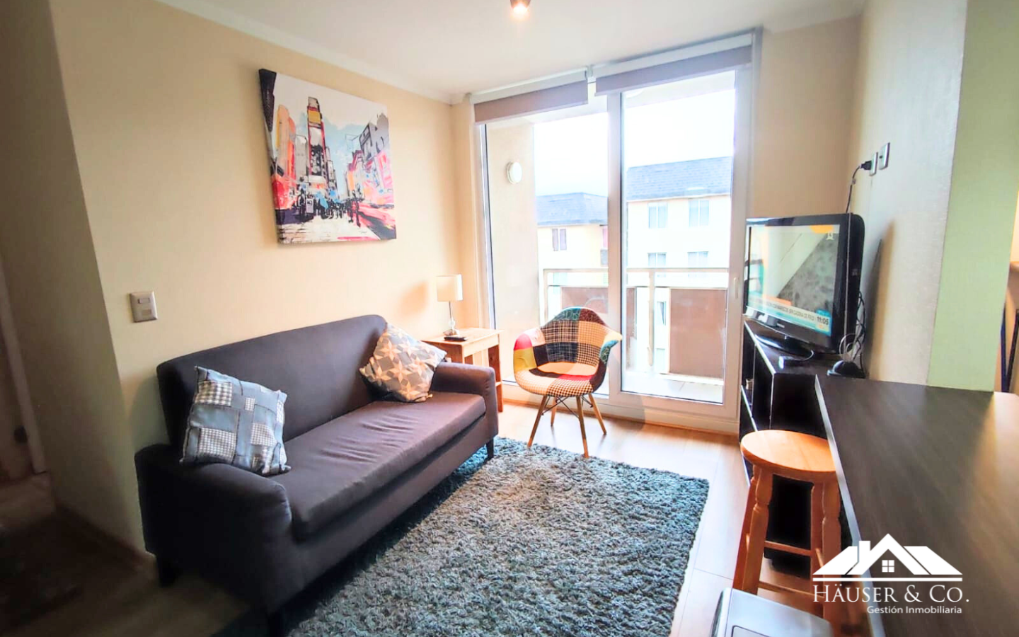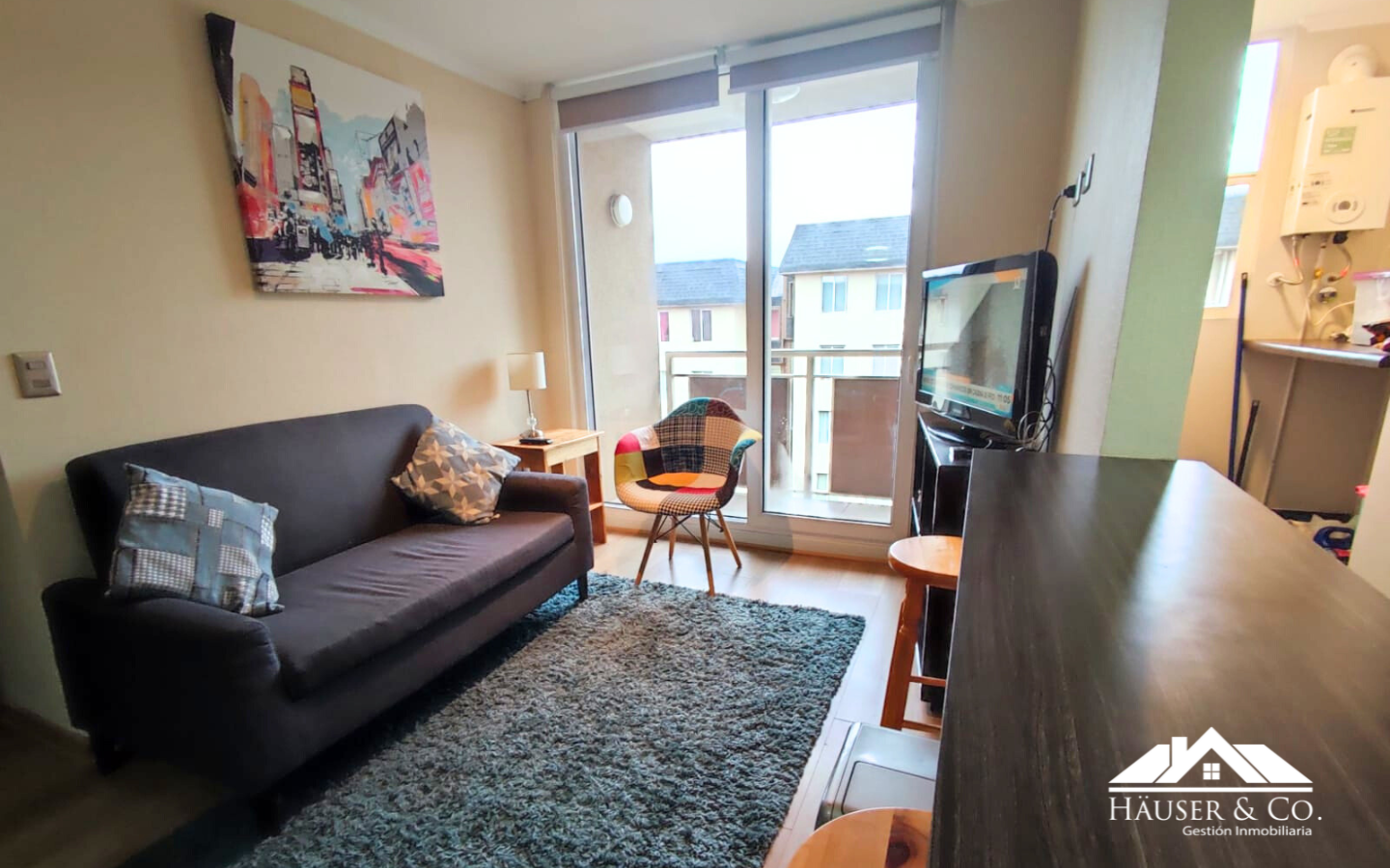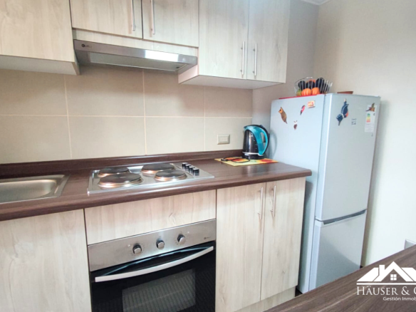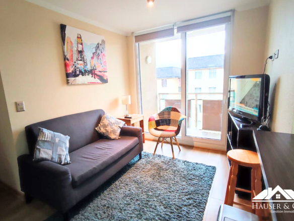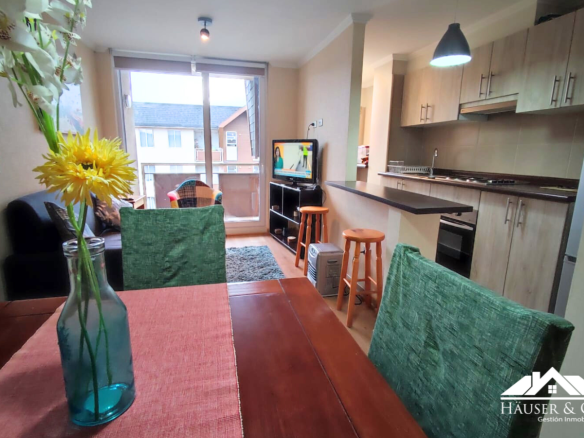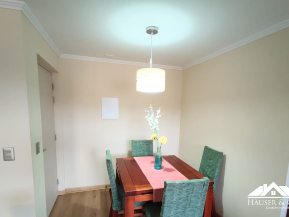 El departamento cuenta con 53 m2 y está en un quinto piso. Posee un living comedor con salida al balcón, cocina americana amoblada y equipada con encimera y horno eléctrico empotrados, además de campana y calefont. Logia y mesa de planchado.