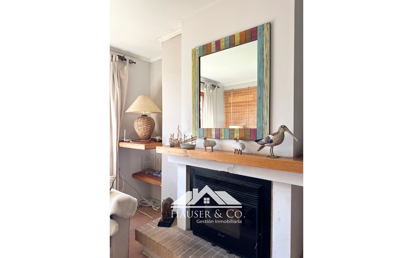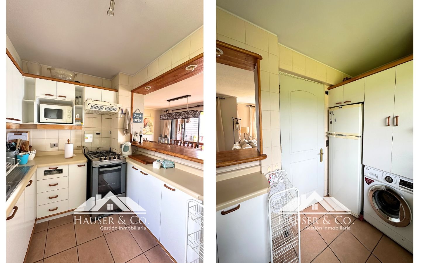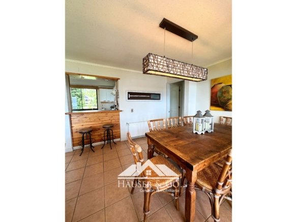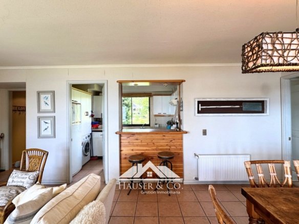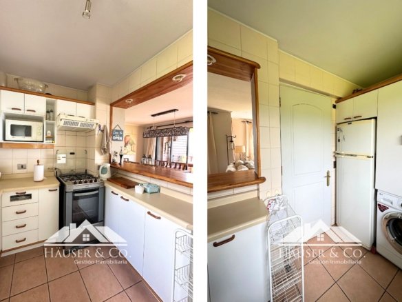 Cómodo living comedor con cocina americana completamente amoblada y equipada con microondas, cocina y horno a gas y campana. Lavadora y lavavajillas.